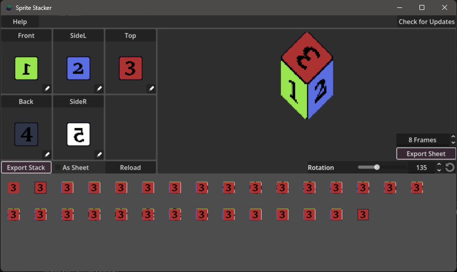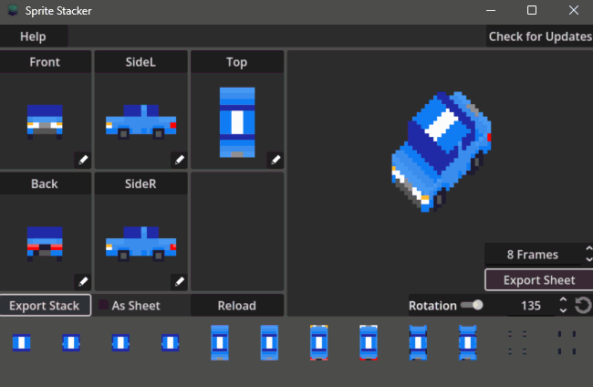 Convert your Pixelart into isometric pseudo 3D spritesheets or export the sprite stack to use them in engine yourself to allow for any 360° rotation on the up-axis. Based on the well-known Sprite Stacking Method.